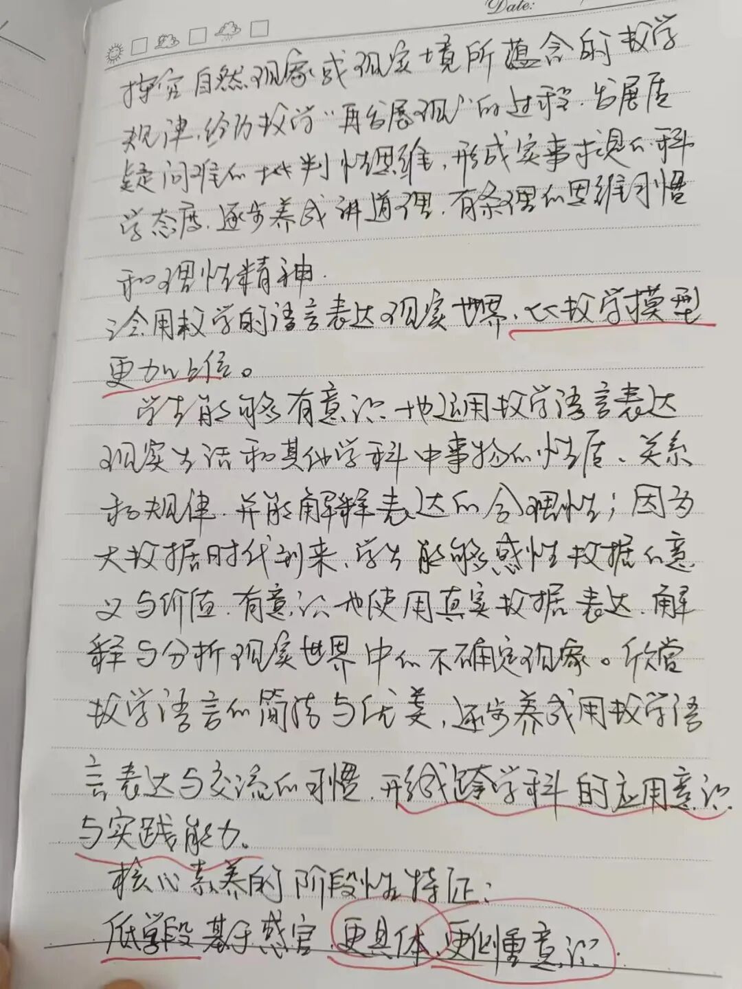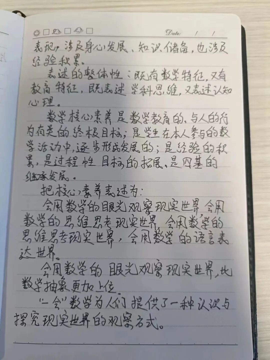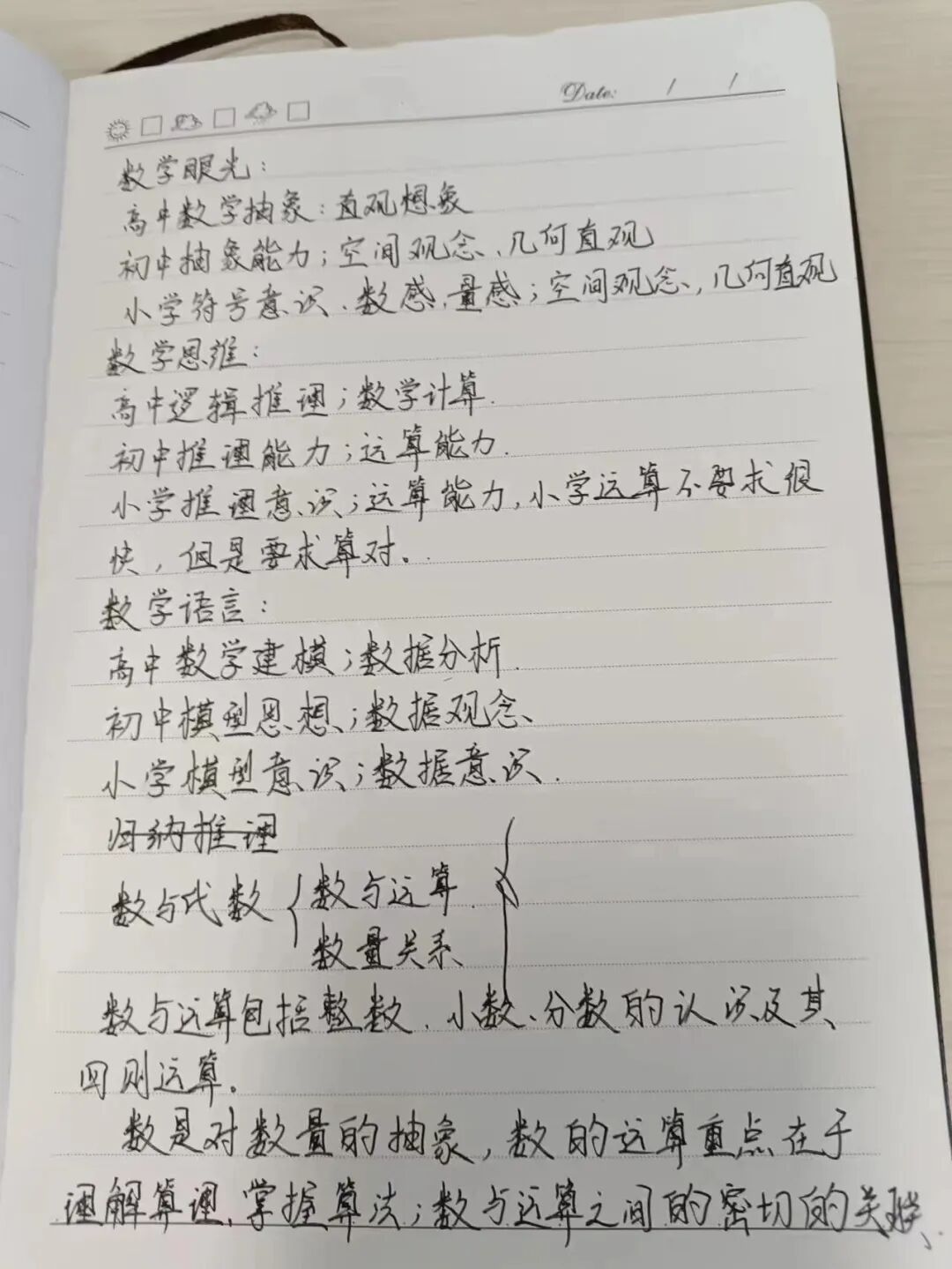 通过学习,我们知道数学课程标准实现了“内容标准”到“内容标准+学业质量标准”的统整,从“三维目标”走向“核心素养”,数学核心素养本质是“三会”——会用数学的眼光观察现实世界、会用数学的思维思考现实世界、会用数学的语言表达现实世界。新课标直接以“三会”为课程目标进行顶层设计,以此统领“四基”、“四能”“情感态度价值观”,构建了义务教育阶段学生发展核心素养的数学课程目标体系。